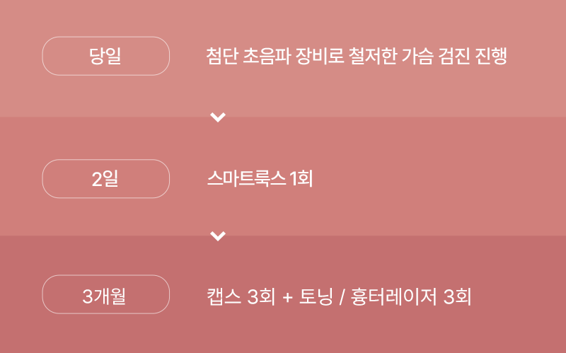 가슴성형은 수술도 중요하지만, 가슴형태가 안정적으로 자리잡도록 도와주는 사후관리 역시 중요합니다. 아모라타성형외과의원은 철저하고 체계적인 에프터프로그램으로 결과에 대한 환자분의 만족도를 높이면서 더욱 완성도 높은 결과를 이끌어 냅니다.